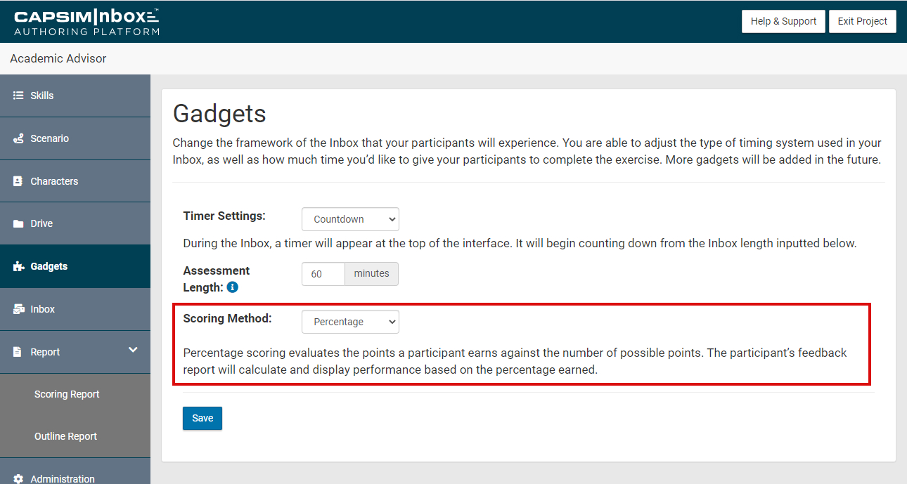 As our authors have been taking more creative approaches with their content, a need was identified to roll out an additional scoring method: percentage scoring. This option can be found on the “Gadgets” page of the platform, as seen below.